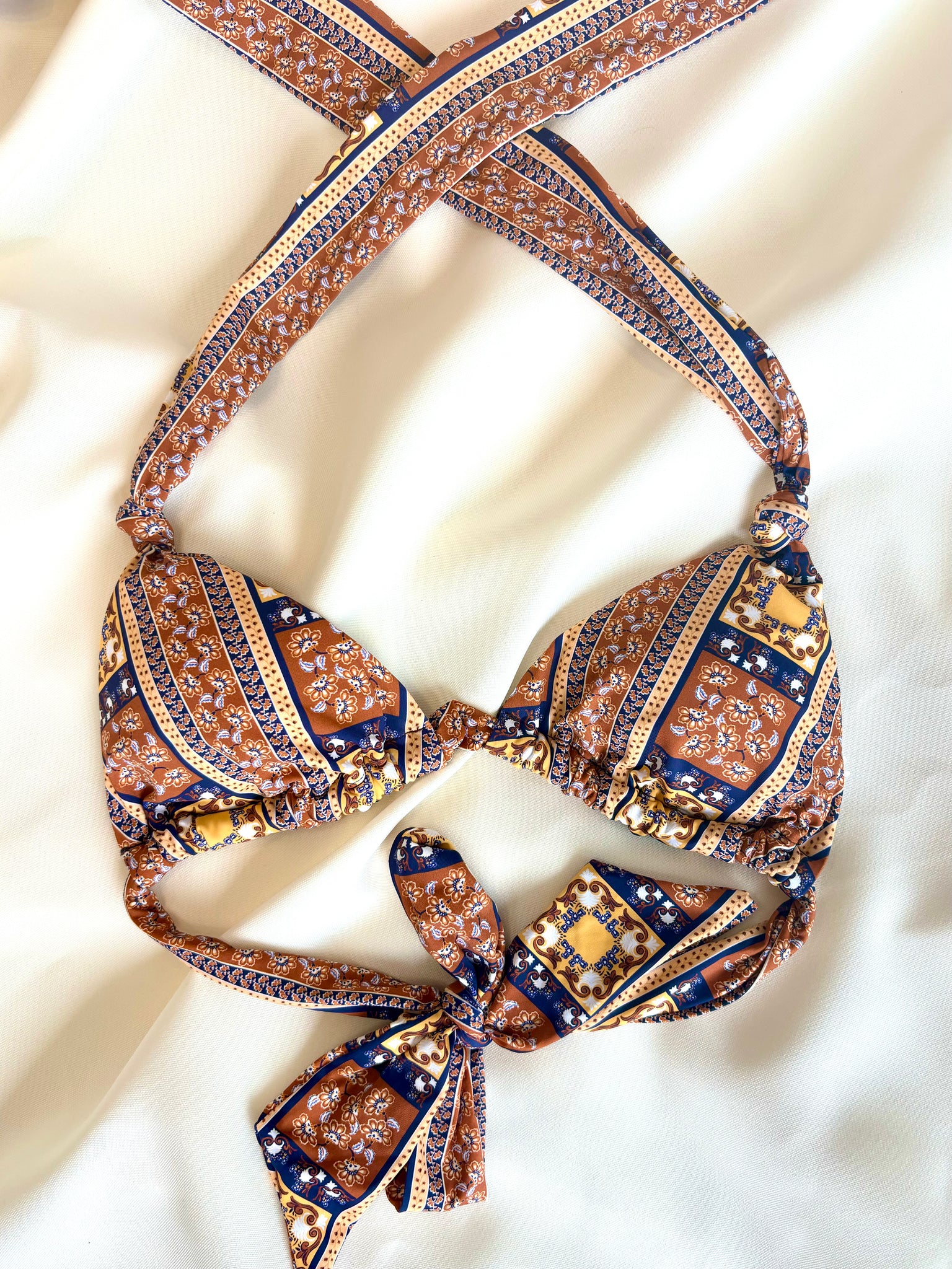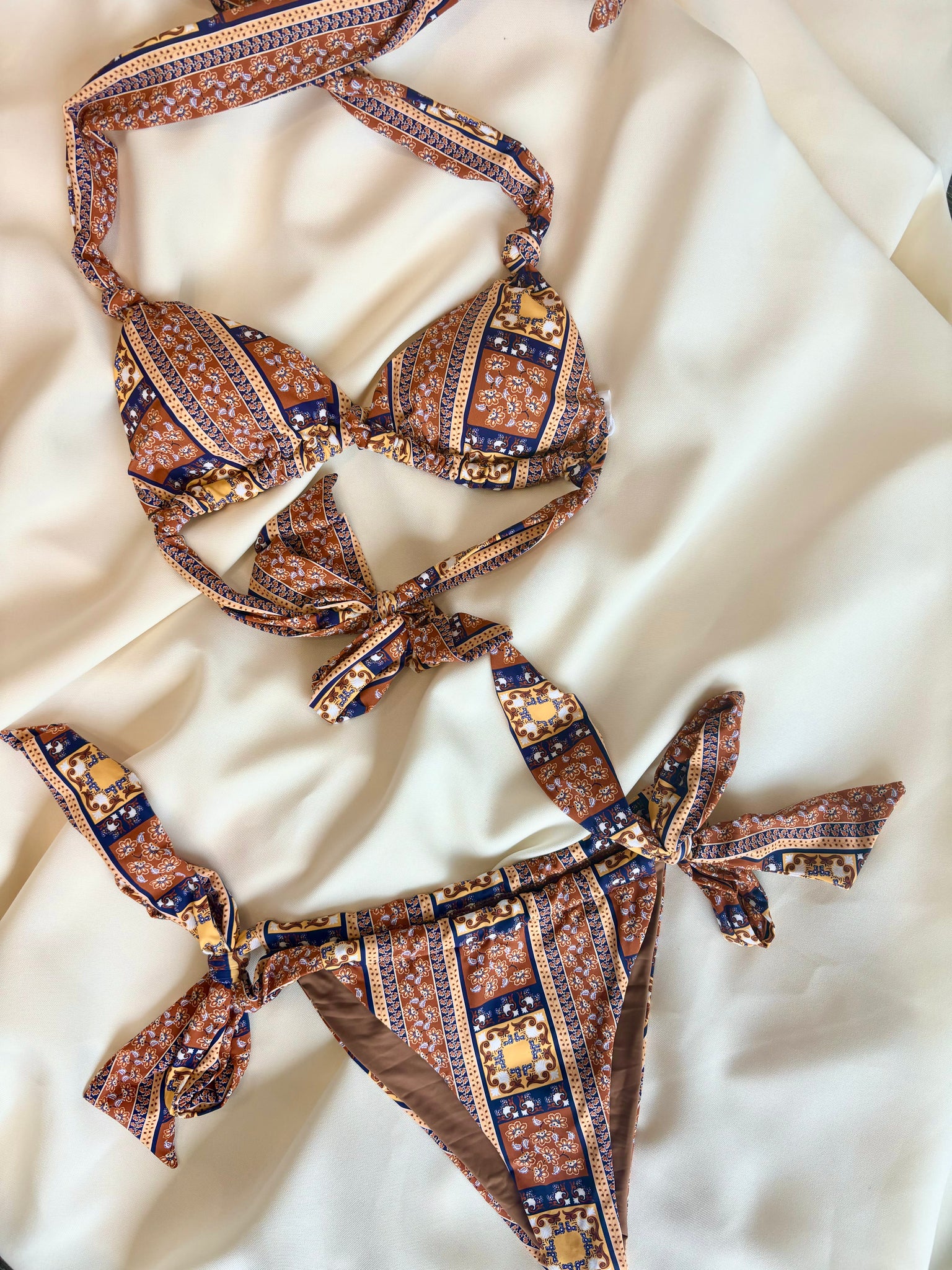 Dive into summer with this vibrant red, blue, and tan patterned bikini! Its playful colors bring the beach vibes wherever you go, making every moment feel like a sunny adventure.- adjustable ties for custom fit- all seamless